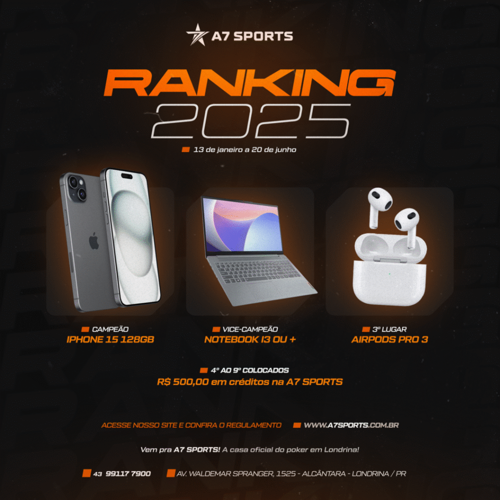 O Campeão do Ranking será aquele que acumular mais pontos ao longo do período compreendido (13/01/2025 a 20/06/2025). Em caso de empate, contaremos como critério de desempate aquele que ganhou mais torneios, depois o maior número de vice-campeonatos, maior número de 3º Lugares, e se ainda assim estiver empatado, o jogador mais velho ficará com a premiação. Qualquer acordo para encerramento do torneio entre os jogadores em uma mesa final, automaticamente atribuirá a todos os restantes a pontuação relativa à posição do próximo jogador eliminado. (Exemplo: um acordo entre os quatro finalistas restantes de um torneio dará pontuação de 4º colocado a todos.) Acordos onde são feitos apenas reajustes de faixas de premiação, são permitidos, desde que: seja reservado ao Campeão pelo menos 10% da premiação total. (Exemplo: Prêmio Total R$ 5.000, a divisão ficaria: Campeão R$ 2000 – Vice Campeão R$ 1.500 – 3º Lugar R$ 1000 – 4º Lugar R$ 600 – 5º Lugar R$ 400) Caso a organização descubra, qualquer tipo de conluio e/o soft play e/ou trapaça e/ou acordo em qualquer fase do torneio, ou mesmo após o término do mesmo, todos os envolvidos poderão não computar pontos naquela etapa para o ranking, ficando ainda a critério da organização o pagamento da premiação bem como a pontuação equivalente, e possível banimento dos jogadores envolvidos da A7 Sports.