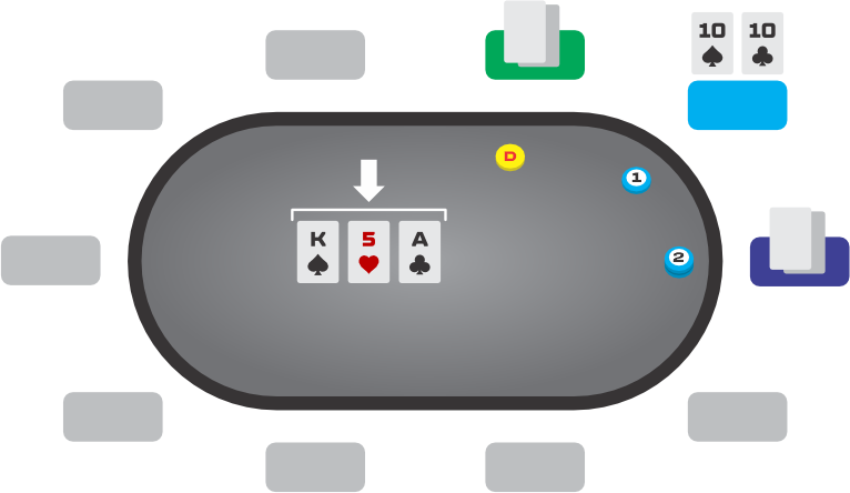 Na primeira rodada de apostas, o jogador à esquerda da big blind é o primeiro a agir. A partir da segunda rodada, o primeiro a agir será sempre aquele que está à esquerda do button.